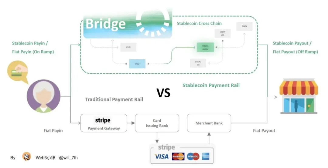 目前,面向企业的稳定币应用大多采用一种“稳定币三明治”架构(Stablecoin Sandwiched),这一术语最早由 Fireblocks 支付与网络高级副总裁 Ran Goldi 于 2021 年提出:即用区块链替代传统支付通道的横向价值/资金传输,上下两端仍依赖老旧金融支付体系。